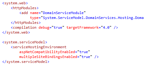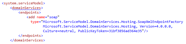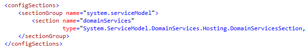 Before I can make a Service Reference to the service I need to define an endpoint in the web.config. First I need to add a custom configuration section for DomainServices within System.ServiceModel.
