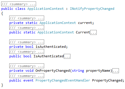 The application context is a class I have placed in the root of my project. It contain a static property called Current used to gain easy access to it’s properties. It implements INotifyPropertyChanged so it’s possible to notify if a property is changed. In this sample I have added a bool property called IsAuthenticated.