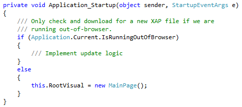 First we need to make sure the update is only done if the user is actually running the application out-of-browser. Application.Current.IsRunningOutOfBrowser will be true if the user has installed the application and running it out-of-browser.