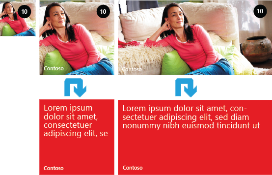 The flip tile template flips from front to back and support all three available sizes: small, medium and wide. The properties for the flip tile template is available using the FlipTileData class.