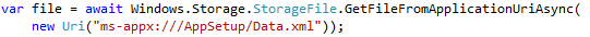 to access the file. As the API is part of the new Windows Phone Runtime, it is required we use “ms-appx:///” to access our file: