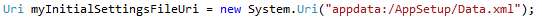 The content of the appdata folder can easily be accessed using the appdata or ms-appx URI scheme names. Although the two schemes point to the same location, there is an important difference in the usage of the two. Use “ms-appx:///” for accessing the appdata folder with APIs that are part of the new Windows Phone Runtime (part of the Windows namespace). In all other APIs use “appdata:/”.
